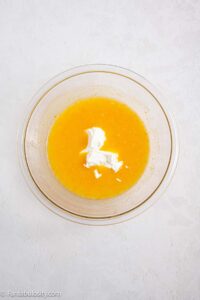 - Add eggs, orange juice, and zest, mixing until smooth.